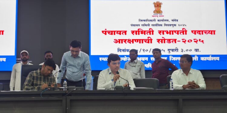 नांदेड, दि. 10 ऑक्टोबर : नांदेड जिल्ह्यातील विविध पंचायत समित्यांमधील सभापती पदांसाठी आरक्षणाची सोडत आज नियोजन भवन, जिल्हाधिकारी कार्यालय नांदेड येथे पार पडली. जिल्हाधिकारी राहुल कर्डिले यांच्या अध्यक्षतेखाली ही सोडत पार पडली. या सोडतीच्या प्रक्रियेला जिल्हा परिषद अधिकारी, विविध पंचायत समित्यांचे प्रतिनिधी, जनप्रतिनिधी आणि संबंधित अधिकारी उपस्थित होते.