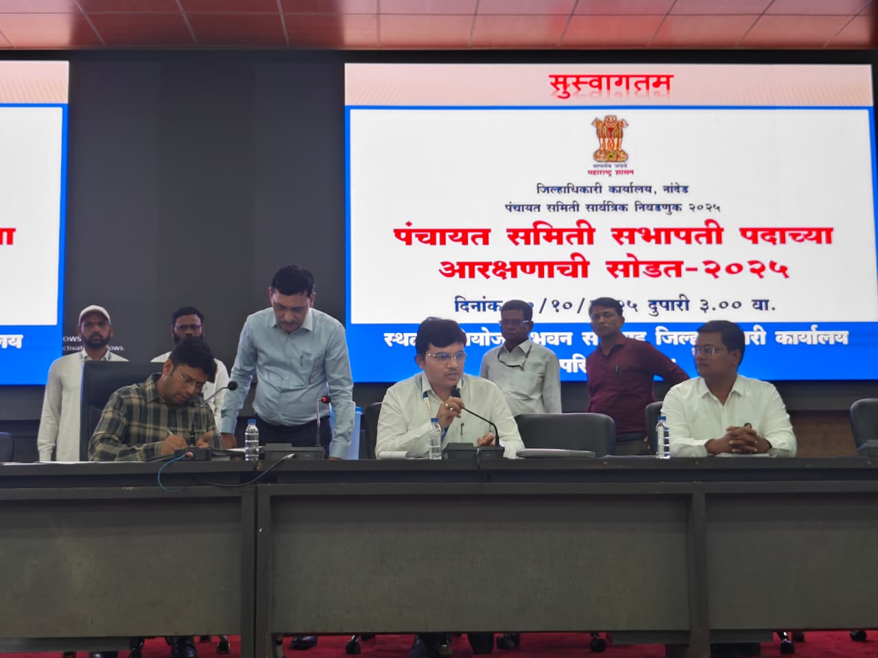 नांदेड, दि. 10 ऑक्टोबर : नांदेड जिल्ह्यातील विविध पंचायत समित्यांमधील सभापती पदांसाठी आरक्षणाची सोडत आज नियोजन भवन, जिल्हाधिकारी कार्यालय नांदेड येथे पार पडली. जिल्हाधिकारी राहुल कर्डिले यांच्या अध्यक्षतेखाली ही सोडत पार पडली. या सोडतीच्या प्रक्रियेला जिल्हा परिषद अधिकारी, विविध पंचायत समित्यांचे प्रतिनिधी, जनप्रतिनिधी आणि संबंधित अधिकारी उपस्थित होते.