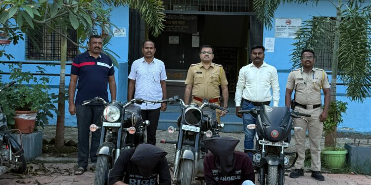 नांदेड दि. 6 नोव्हेंबर :- (प्रतिनिधी) माधव वाघमारे नांदेड ग्रामीण पोलीस स्टेशनच्या गुन्हे शोध पथकाने मध्यरात्री मोठी कारवाई करत कुसुमताई शाळेजवळ कर्कश आवाज करत मोटरसायकलवर स्टंट करणाऱ्या दोन जणांना ताब्यात घेतले. यात दोन वयस्क आरोपींसह दोन विधी संघर्ष बालकांचा समावेश आहे. या कारवाईत दोन रॉयल एनफिल्ड बुलेट व एक पल्सर मोटरसायकल असा एकूण तीन वाहनांचा मुद्देमाल ताब्यात घेण्यात आला आहे.
