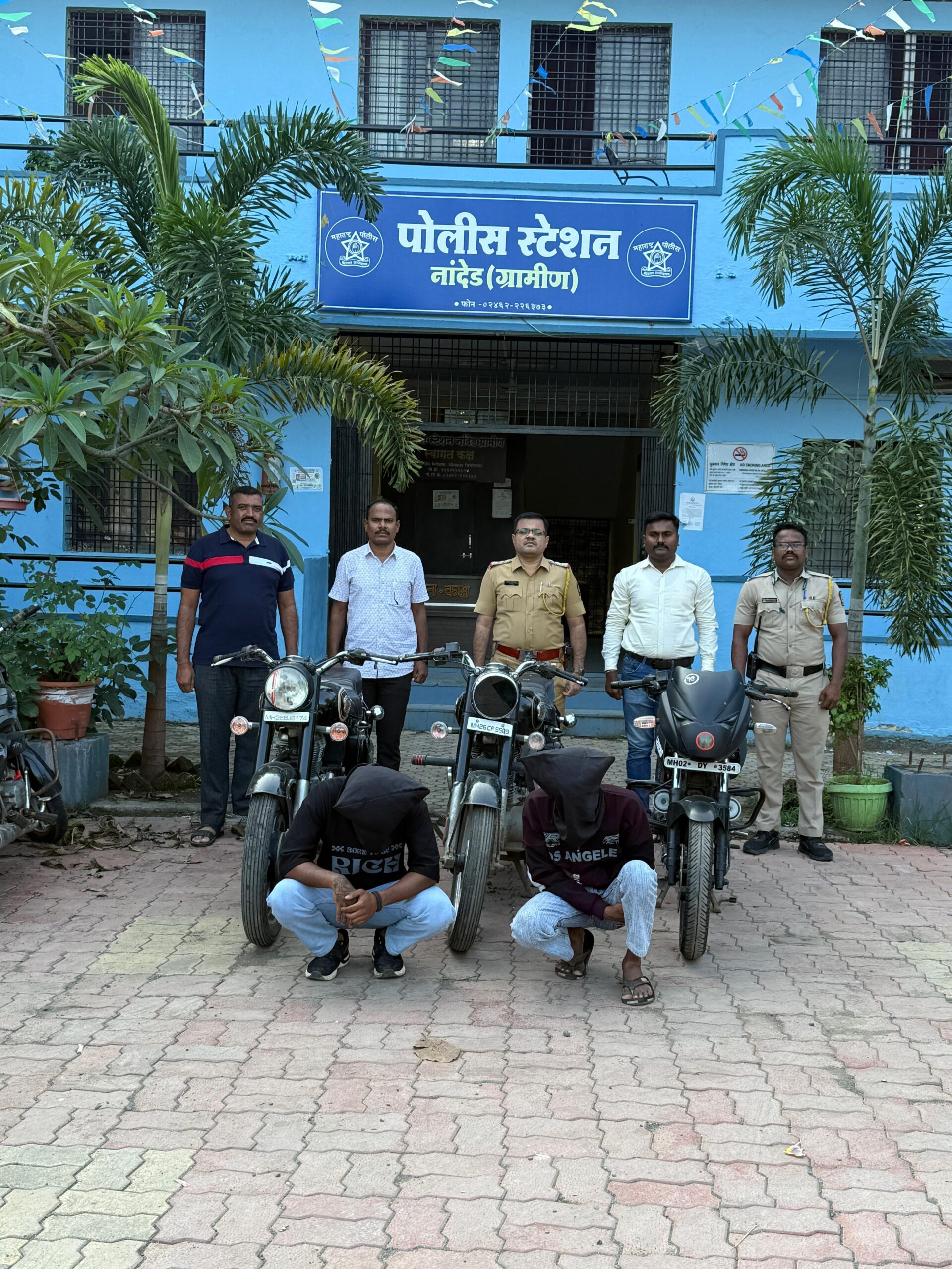 नांदेड दि. 6 नोव्हेंबर :- (प्रतिनिधी) माधव वाघमारे नांदेड ग्रामीण पोलीस स्टेशनच्या गुन्हे शोध पथकाने मध्यरात्री मोठी कारवाई करत कुसुमताई शाळेजवळ कर्कश आवाज करत मोटरसायकलवर स्टंट करणाऱ्या दोन जणांना ताब्यात घेतले. यात दोन वयस्क आरोपींसह दोन विधी संघर्ष बालकांचा समावेश आहे. या कारवाईत दोन रॉयल एनफिल्ड बुलेट व एक पल्सर मोटरसायकल असा एकूण तीन वाहनांचा मुद्देमाल ताब्यात घेण्यात आला आहे.