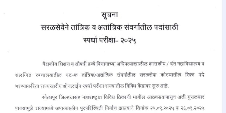 जिल्ह्यासह महाराष्ट्रातील विविध ठिकाणी मुसळधार पावसामुळे निर्माण झालेल्या परिस्थितीमुळे २५ सप्टेंबर २०२५ व २६ सप्टेंबर २०२५ रोजी होणाऱ्या परीक्षा पुढे ढकलण्यात आल्या आहेत.
