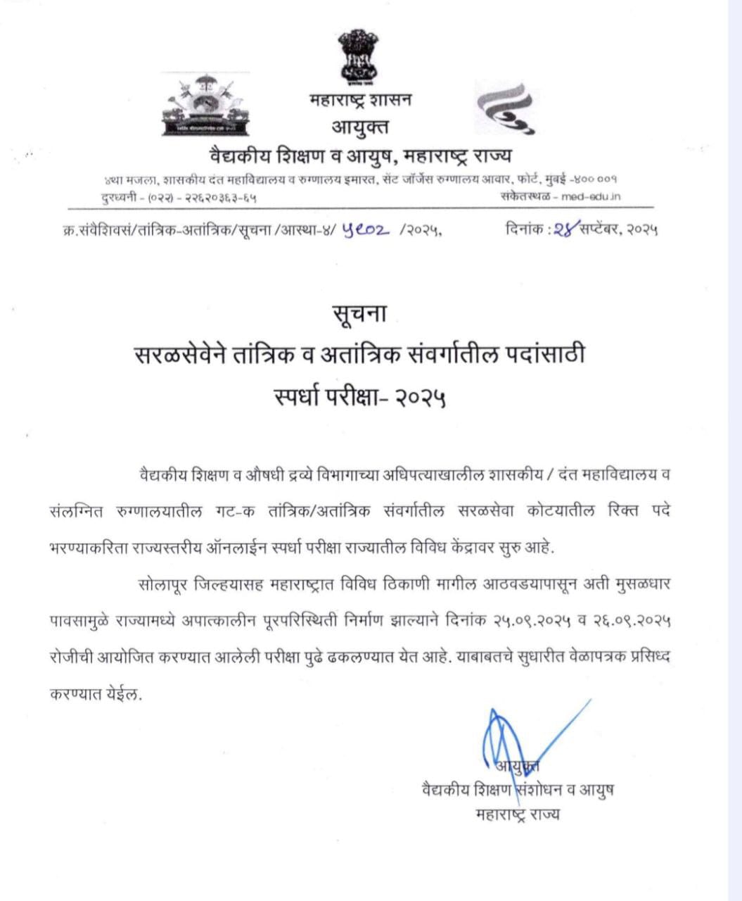 मुंबई – वैद्यकीय शिक्षण व औषधी द्रव्य विभागाच्या (DMER) अधिपत्याखालील शासकीय वैद्यकीय शिक्षण व आयुष्य महाराष्ट्र राज्य महाविद्यालय व संलग्न रुग्णालयातील गट-क तांत्रिक/अतांत्रिक संवर्गातील सरळसेवा कोट्यातील रिक्त पदे भरण्यासाठी राज्यस्तरीय ऑनलाईन स्पर्धा परीक्षा राज्यातील विविध केंद्रावर सुरू होत्या.