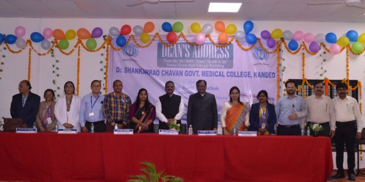 नांदेड, दि. ८ ऑक्टोबर – डॉ. शंकरराव चव्हाण शासकीय वैद्यकीय महाविद्यालय, विष्णूपुरी येथे नवीन प्रवेशित एम.बी.बी.एस. (2025-26) विद्यार्थ्यांचे स्वागत करण्यासाठी आयोजित ‘Dean’s Address’ हा कार्यक्रम मोठ्या उत्साहात संपन्न झाला. हा कार्यक्रम विद्यार्थ्यांना वैद्यकीय शिक्षणातील शैक्षणिक, नैतिक आणि व्यावसायिक मूल्यांची ओळख करून देणारा ठरला.