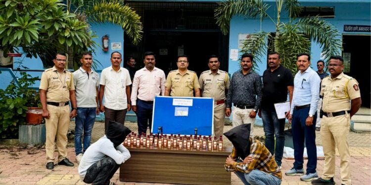 नांदेड ग्रामीण पोलीस ठाण्याच्या पथकाने वाजेगाव बायपास रोडवरील दोघा आरोपींना अटक केली आहे. त्यांच्या कडून रॉयल स्टॅग 180 ML31 बाटला किंमत 250 प्रमाणे एकूण १०,७५० रुपयांचा मुद्देमाल हस्तगत करण्यात आला आहे.