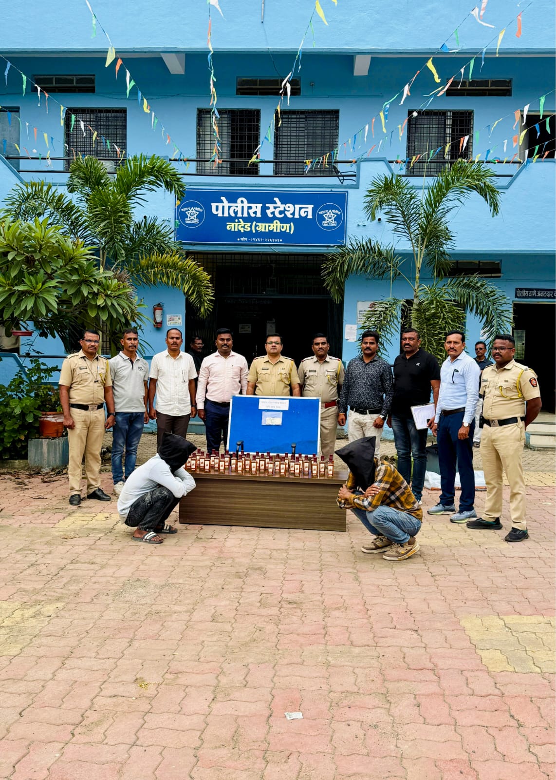 नांदेड ग्रामीण पोलीस ठाण्याच्या पथकाने वाजेगाव बायपास रोडवरील दोघा आरोपींना अटक केली आहे. त्यांच्या कडून रॉयल स्टॅग 180 ML31 बाटला किंमत 250 प्रमाणे एकूण १०,७५० रुपयांचा मुद्देमाल हस्तगत करण्यात आला आहे.