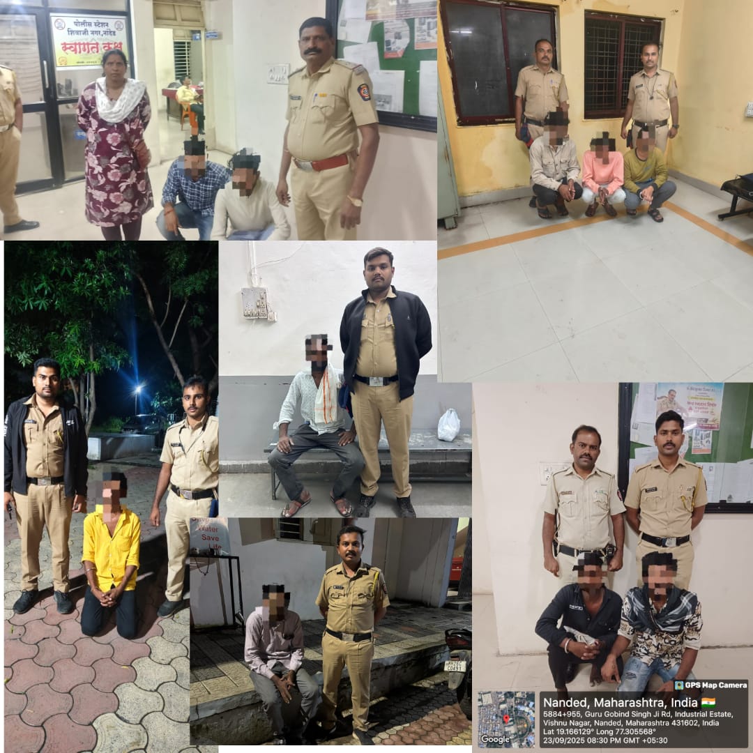 नांदेड (२४ सप्टेंबर) : शहरातील सार्वजनिक ठिकाणी दारू पिऊन गोंधळ घालणारे, शांतता भंग करणाऱ्यांविरोधात नांदेड पोलिसांनी धडक कारवाई सुरू केली आहे. पोलिस अधीक्षक मा. श्री. अबीनाश कुमार यांच्या मार्गदर्शनाखाली व अप्पर पोलिस अधीक्षक मा. श्री. सुरज गुरव व सा.पोलिस निरीक्षक क मा. श्री. भगवात नागरगोजे यांच्या नेतृत्वाखाली सिटी स्ट्राईक सेफ्टी ड्राईव्ह अंतर्गत विशेष मोहिम राबवण्यात आली.