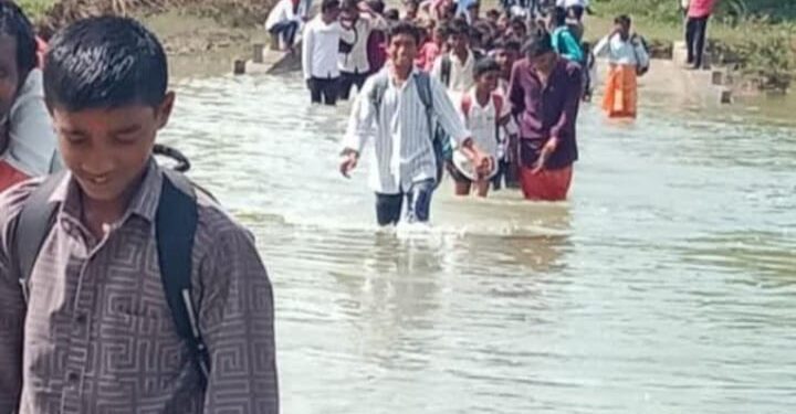 नांदेड दक्षिण :-राहेगाव ता. जि. नांदेड गेल्या काही दिवसांपासून नांदेड जिल्ह्यात मुसळधार पावसाने हजेरी लावलेली आहे या पावसामुळे बरेच गाव व शेती व इतर सर्व नुकसान झालेले आहे नांदेड तालुक्यात राहेगाव गावातील विद्यार्थी काकांडी येथील शिवशक्ती माध्यमिक व उच्च माध्यमिक विद्यालय येथे शिक्षण घेत असतात त्यांना राहेगाव येथून काकांडी कडे किमान 7 ते 8 किलोमीटर दररोज शाळेमध्ये जावे लागते त्यांना शाळेमध्ये बस उपलब्ध असून सुद्धा बस साईटला थांबून विद्यार्थी पुलावर पाणी वाहत असताना त्या फुला वरून विद्यार्थी शाळेत जाताना दिसत आहेत जर हे विद्यार्थी पाण्यात वाहून गेले तर कोण जिम्मेदार…