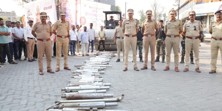 शहरात कर्कश आवाज करत आणि सायलेन्सरमध्ये बदल करून ‘फटाके’ फोडणाऱ्या बुलेटस्वारांना नांदेड पोलिसांनी चांगलाच दणका दिला आहे. २४ मार्च रोजी सायंकाळी शहरातील महावीर चौकात स्वतः पोलीस अधीक्षक अबिनाश कुमार यांच्या उपस्थितीत जप्त करण्यात आलेल्या शेकडो अवैध सायलेन्सरवर रोडरोलर फिरवून ते नष्ट करण्यात आले. पोलिसांच्या या धडाकेबाज कारवाईमुळे छपरी स्टाईलने वाहन चालवणाऱ्यांमध्ये मोठी धडकी भरली आहे.