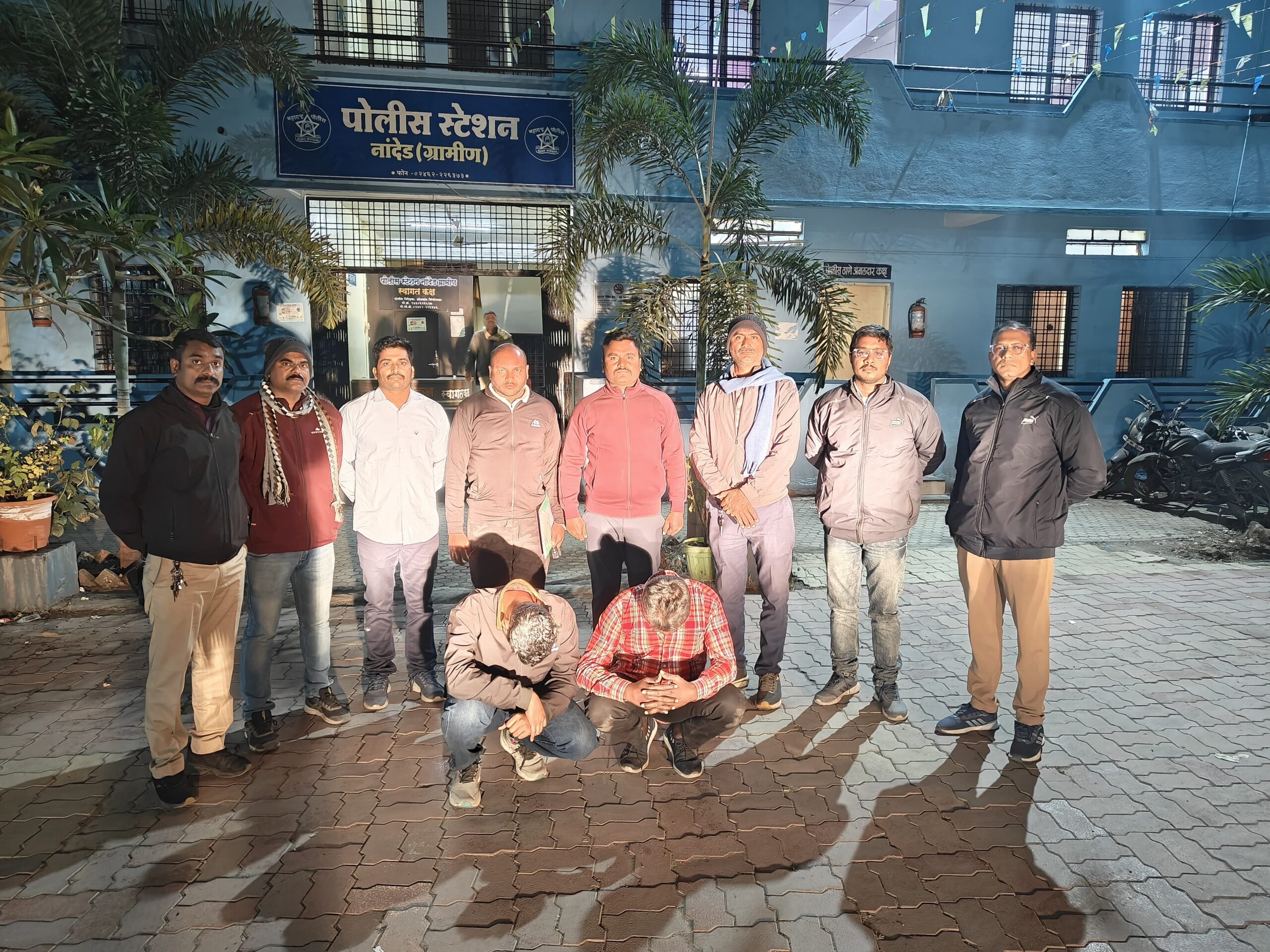 अखेर सापळा रचून नांदेड ग्रामीण हद्दीतून दोन्ही आरोपींना ताब्यात घेण्यात आले. ताब्यात घेण्यात आलेल्या आरोपींची नावे १) संदीप रंगराव भुर्के (वय २८ वर्षे, व्यवसाय मजुरी, रा. चिखलवाडी, ता. भोकर, जि. नांदेड) आणि २) ओंप्रकाश गणेश किरण (वय २४ वर्षे, व्यवसाय मजुरी, रा. चिखलवाडी, ता. भोकर, जि. नांदेड) अशी आहेत.